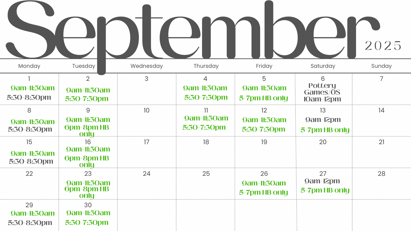 Please sign up for wheel or handbuild/glaze time at the links below to save spot then purchase the time prior to the scheduled session.